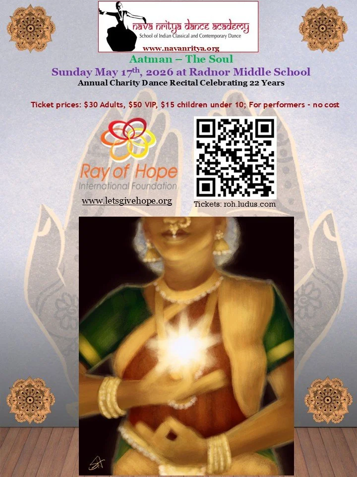 June - "Vinyasa – Divine Connections" - Nava Nritya Dance Academy''s annual charity recital in Ambler, PA dedicated to Ray of Hope International Foundation – our own charity focused on changing 120,000 lives a year